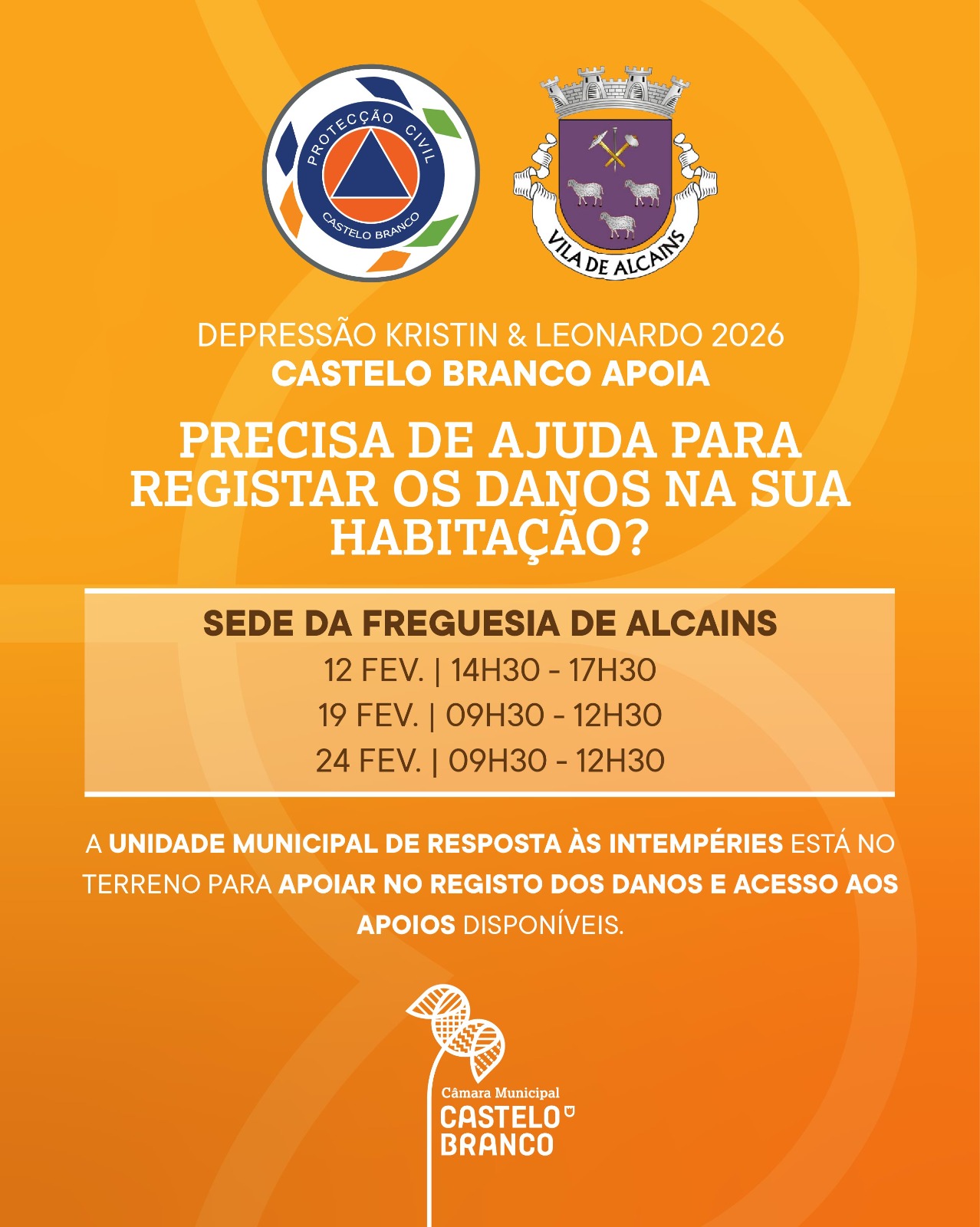 Na sequência das severas condições meteorológicas que se verificaram durante a 𝗽𝗮𝘀𝘀𝗮𝗴𝗲𝗺 𝗱𝗮 𝗱𝗲𝗽𝗿𝗲𝘀𝘀ã𝗼 “𝗞𝗿𝗶𝘀𝘁𝗶𝗻” sobre a nossa freguesia de Alcains, venho, na qualidade de Presidente da Junta de Freguesia, manifestar a minha solidariedade para com todos os que foram afetados por esta situação, em particular as famílias que sofreram danos nas suas habitações, terrenos […]